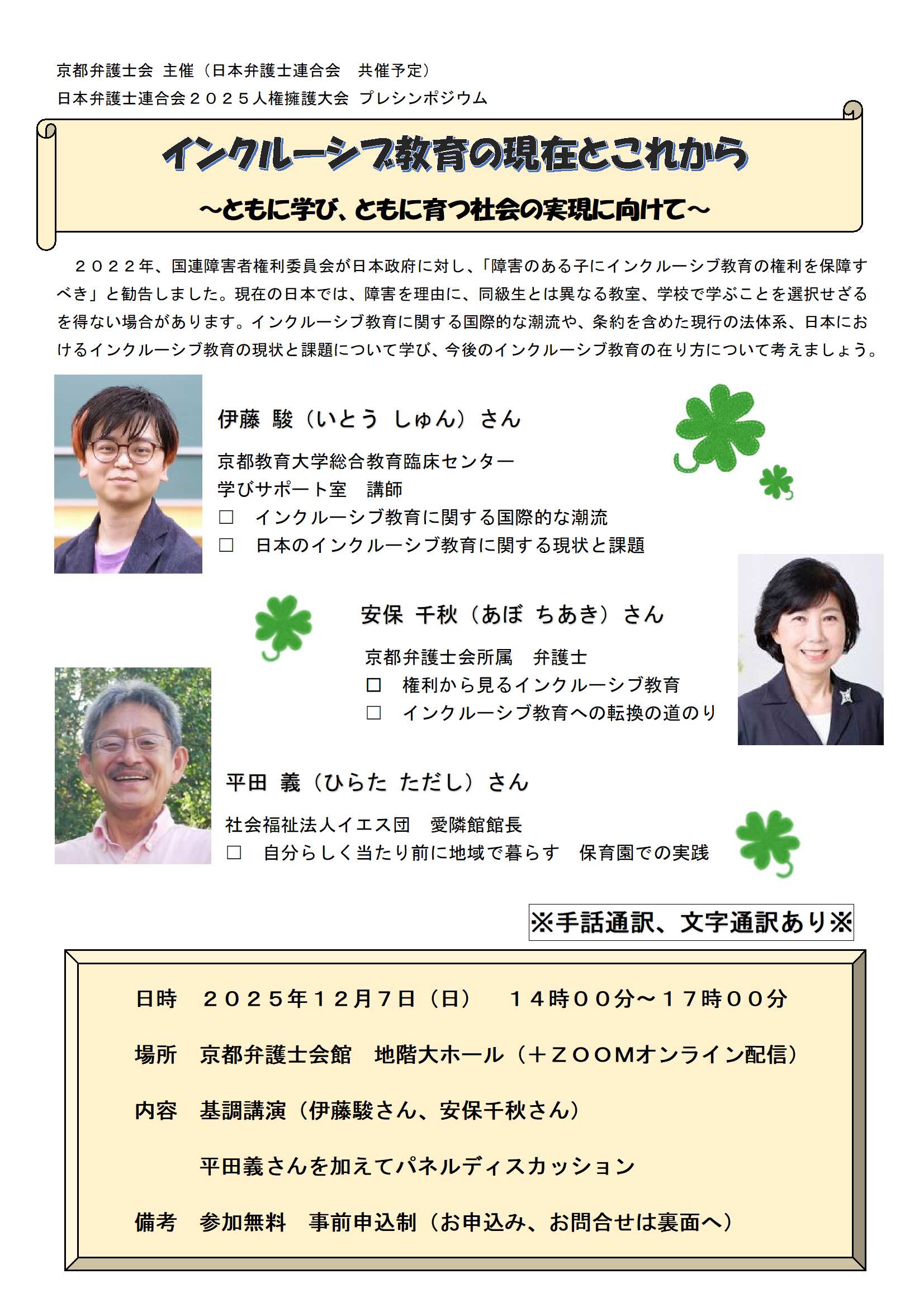 場所:京都弁護士会館(京都市中京区富小路丸太町下る)地階大ホール、Zoom(ウェビナー)