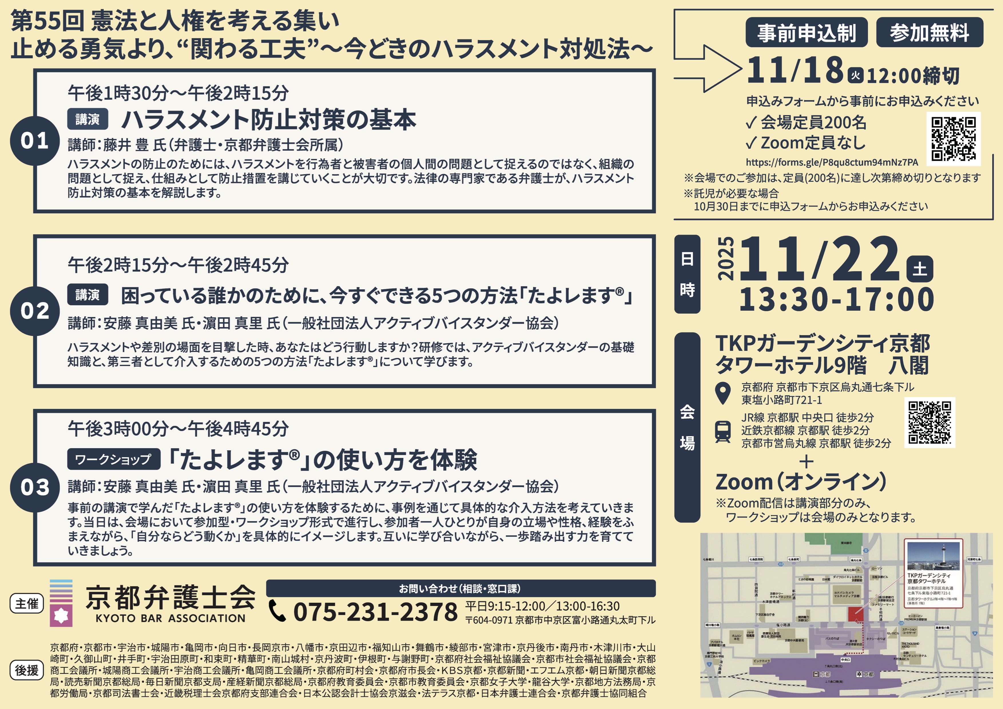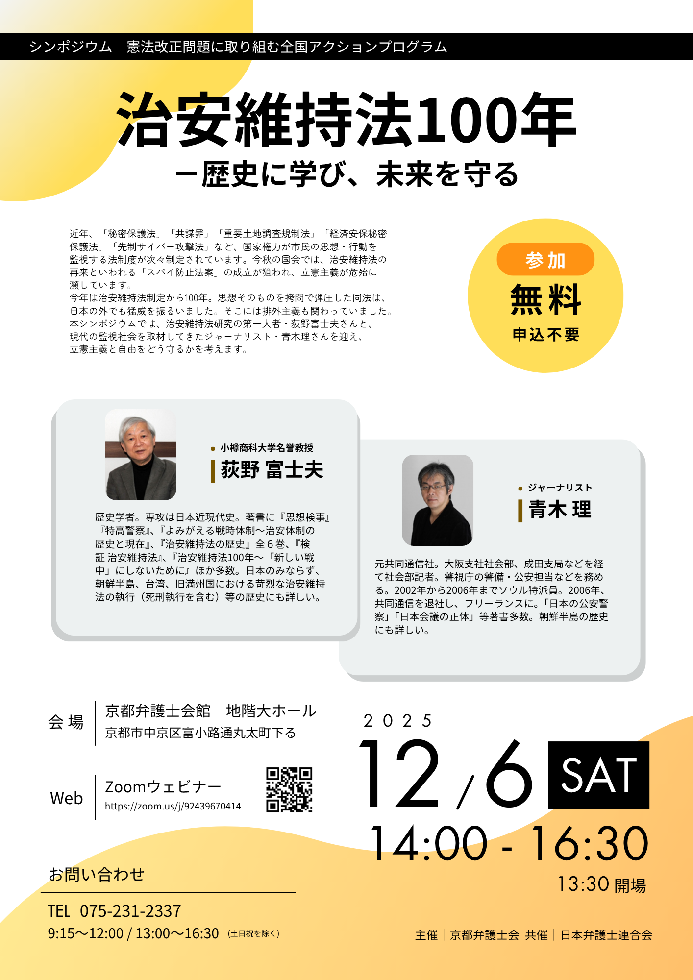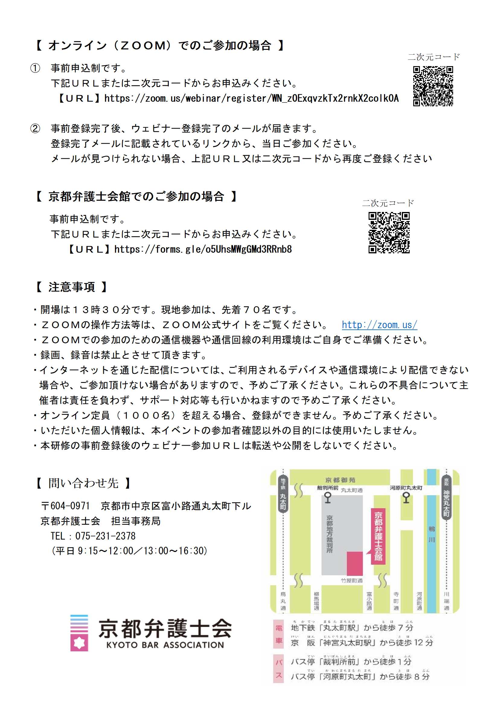 場所:京都弁護士会館(京都市中京区富小路丸太町下る)地階大ホール、Zoom(ウェビナー)